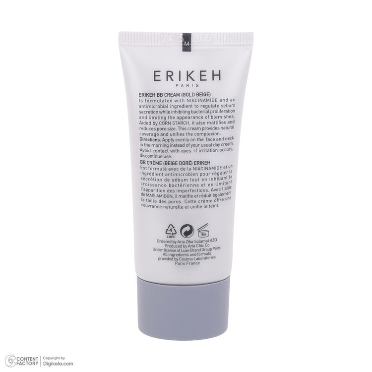 بی بی کرم ضد آکنه رنگی اریکه، مناسب پوست مختلط تا چرب است و ترشح سبوم را کنترل میکند. بی بی کرم ضدآکنه رنگی ERIKEH از برق زدن پوست جلوگیری نموده و با مبارزه با باکتریها، از بروز جوش و آکنه جلوگیری میکند. بی بی کرم ضد آکنه رنگ بژ طلایی ERIKEH، مناسب پوست مختلط تا چرب است. BB کرم اریکه منافذ باز پوست را جمع کرده و نواقص صورت را میپوشاند. بی بی کرم ضد آکنه رنگ Gold Beige اریکه حاوی نیاسینامید بوده و باکتریهای مولد جوش و آکنه را از بین میبرد. نیاسینامید یا همان ویتامین B3 موجود در این محصول تولید کلاژن در پوست را نیز افزایش داده و روند پیری پوست را کند میکند. این ویتامین لکهای پوست و قرمزی را از بین میبرد و از پوست در برابر اشعههای مضر خورشید محافظت مینماید. همچنین این محصول براقی پوست را رفع نموده و عملکرد سد دفاعی پوست را تقویت میکند. بی بی کرم پوست رنگی چرب اریکه حاوی کلرفنزین و نشاسته ذرت بوده و غدد ترشح چربی را کنترل میکند.