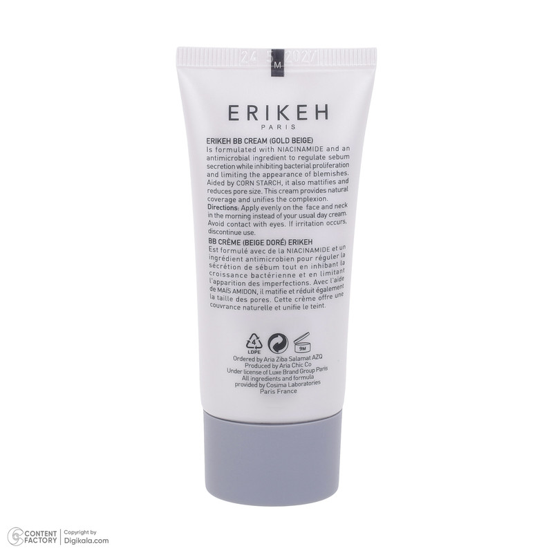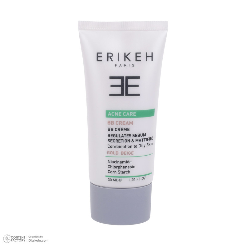 بی بی کرم ضد آکنه رنگی اریکه، مناسب پوست مختلط تا چرب است و ترشح سبوم را کنترل میکند. بی بی کرم ضدآکنه رنگی ERIKEH از برق زدن پوست جلوگیری نموده و با مبارزه با باکتریها، از بروز جوش و آکنه جلوگیری میکند. بی بی کرم ضد آکنه رنگ بژ طلایی ERIKEH، مناسب پوست مختلط تا چرب است. BB کرم اریکه منافذ باز پوست را جمع کرده و نواقص صورت را میپوشاند. بی بی کرم ضد آکنه رنگ Gold Beige اریکه حاوی نیاسینامید بوده و باکتریهای مولد جوش و آکنه را از بین میبرد. نیاسینامید یا همان ویتامین B3 موجود در این محصول تولید کلاژن در پوست را نیز افزایش داده و روند پیری پوست را کند میکند. این ویتامین لکهای پوست و قرمزی را از بین میبرد و از پوست در برابر اشعههای مضر خورشید محافظت مینماید. همچنین این محصول براقی پوست را رفع نموده و عملکرد سد دفاعی پوست را تقویت میکند. بی بی کرم پوست رنگی چرب اریکه حاوی کلرفنزین و نشاسته ذرت بوده و غدد ترشح چربی را کنترل میکند.