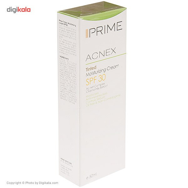 کرم مرطوبکننده برند «پریم» (Prime) مدل (Acnex Tinted) حجمی معادل 50 میلیلیتر دارد که از نوع رنگی است. مرطوبکنندهی پریم با SPF30 میتواند نقش یک ضدآفتاب را هم داشته باشد؛ هرچند میزان SPF بالا نیست اما بازهم از برخورد اشعههای مضر نور خورشید پوست را محفوظ نگهمیدارد. این کرم مرطوب هم بهعنوان یک ضدآفتاب و هم بهعنوان یک کرمپودر قابل استفاده است. پریم آبرسانی به پوست را برعهده دارد و رطوبت موردنیاز پوست را هم حفظ میکند و خشک شدن پوست جلوگیری میکند. مرطوبکنندهی پریم فاقد چربی است و برای افرادی که پوستهایی چرب و بسیار چرب دارند مناسب است. پریم ضدجوش و آکنه است و توانایی کنترل سبوم پوست را دارد. استفاده از پریم نقصها و عیوب صورتتان را میپوشاند و جلوهای زیبا، خوشرنگ و بدون نقص به پوست شما میبخشد. پریم علاوهبر مرطوبکنندگی خاصیت نرمکنندگی پوست را هم دارد و استفاده از کرم پریم نرمی و لطافت پوست را هم بهدنبال دارد. محفظهی نگهدارندهی کرم مرطوبکننده و نرمکنندهی پریم تیوپی و از جنس پلاستیک است که استفادهی بسیار آسانی دارد.