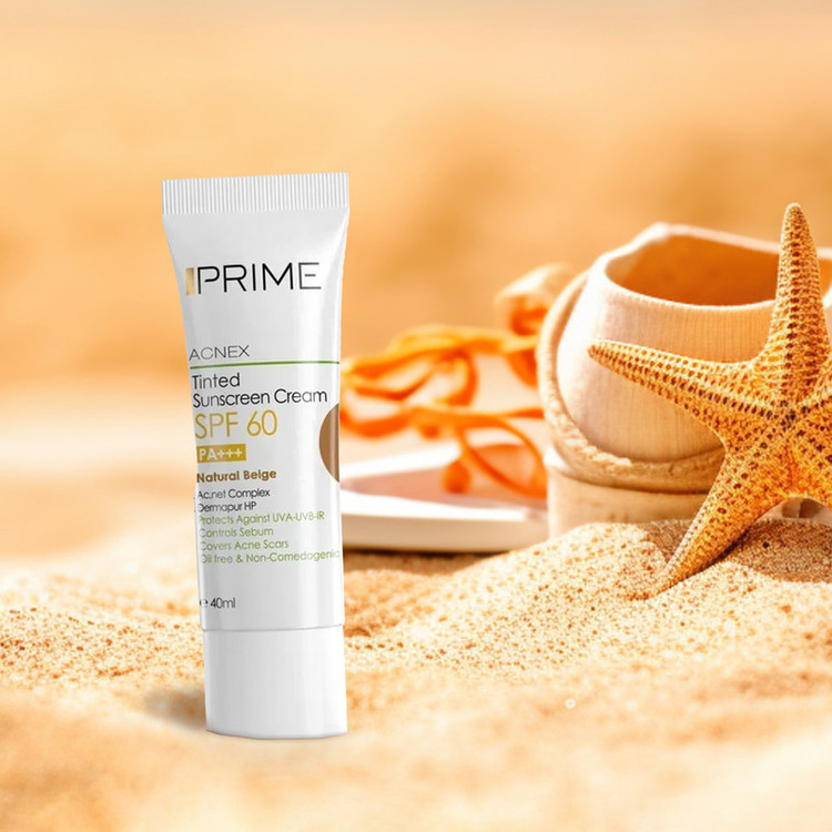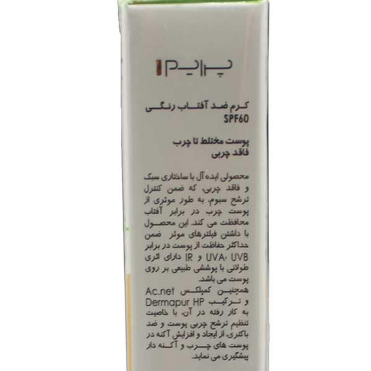 کرم ضدآفتاب رنگی پرایم، 60 SPF، مدل 02، مناسب پوست چرب و مختلط تنالیته رنگ متوسط و حجم 40 میلیلیتر، محافظت کننده در برابر اشعه UVA،IRو UVB، کنترل کننده ترشح سبوم، فاقد چربی و غیر کومدونزا، +++PA، پوشش دهنده جای جوش، با ماندگاری 3 ساعته