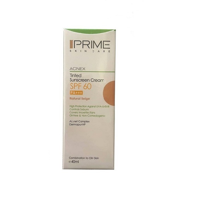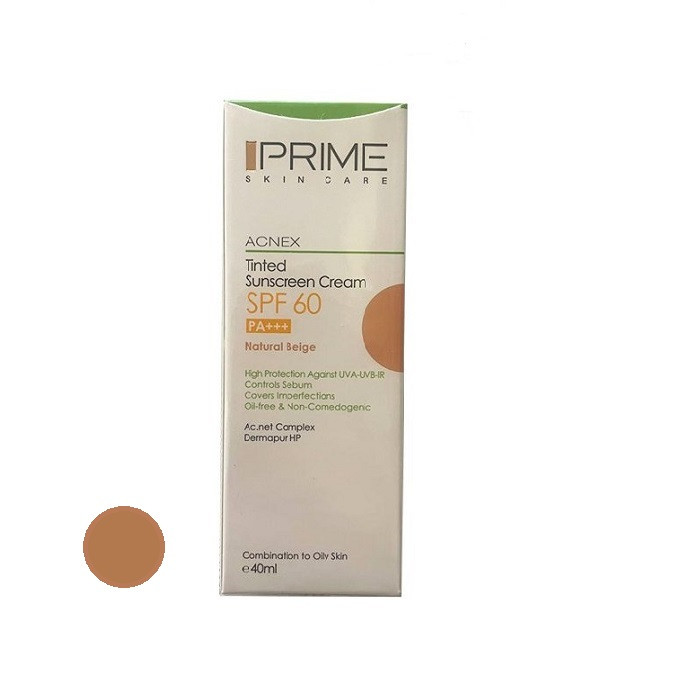 کرم ضدآفتاب رنگی پرایم، 60 SPF، مدل 02، مناسب پوست چرب و مختلط تنالیته رنگ متوسط و حجم 40 میلیلیتر، محافظت کننده در برابر اشعه UVA،IRو UVB، کنترل کننده ترشح سبوم، فاقد چربی و غیر کومدونزا، +++PA، پوشش دهنده جای جوش، با ماندگاری 3 ساعته