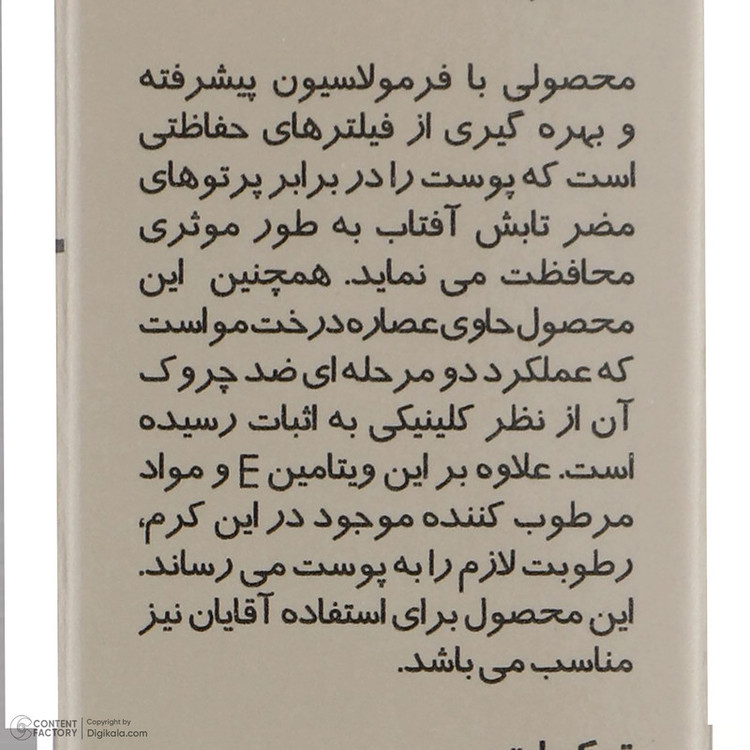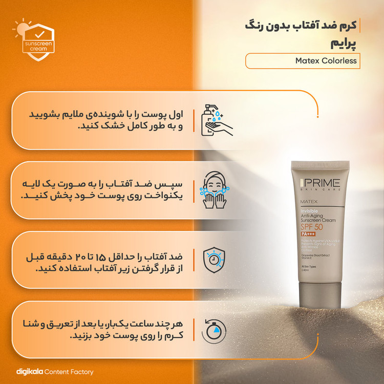 کرم ضد آفتاب بدون رنگ SPF50 یکی از محصولات کارخانه پرایم است که به عنوان محصولی ایرانی با کیفیت بالا رقیبی جدی برای همتایان خارجی خود به شمار میرود. این محصول محافظی قوی برای پوست در برابر اشعه های UVA، UVB، IR به شمار میرود. این محصول که در ساخت آن از عصاره ساقه انگور استفاده شده فاقد چربی است و میتواند انواع لک و جای جوش را بپوشاند. بهترین روش مصرف برای این کرم ضدآفتاب پوشاندن پوست با مقدار کافی از کرم 20 دقیقه قبل از قرار گرفتن در معرض نور آفتاب است. برای بهترین نتیجه بهتر از مصرف کنندهی این کرم هر 2 ساعت یک بار یک لایه جدید از کرم روی پوست خود بکشد. همچنین در مواردی مانند تعریق شدید، شنا و یا در ساعاتی از روز که تابش نور شدیدتر است میتوان ضدآفتاب را در فواصل زمانی کوتاهتر تجدید کرد. مدت انقضای این محصول که به صورت یک تیوپ ارائه شده است از طرف شرکت سازنده 36 ماه از زمان ساخت اعلام شده و حجم بطری آن 40 میلیلیتر است. این محصول که ویژهی صورت در نظر گرفته شده برای پوست آقایان و خانمها ساخته شده است. بنابر این محدودیتی در جنسیت مصرف کننده و ندارد و برای تمامی سنین نیز مناسب است. یکی از توصیههایی که پیش از مصرف لوازم آرایشی و خصوصا کرم ذکر میشود، تست حساسیت است تا از عدم بروز حساسیت در برابر مواد موجود در کرم اطمینان حاصل گردد.