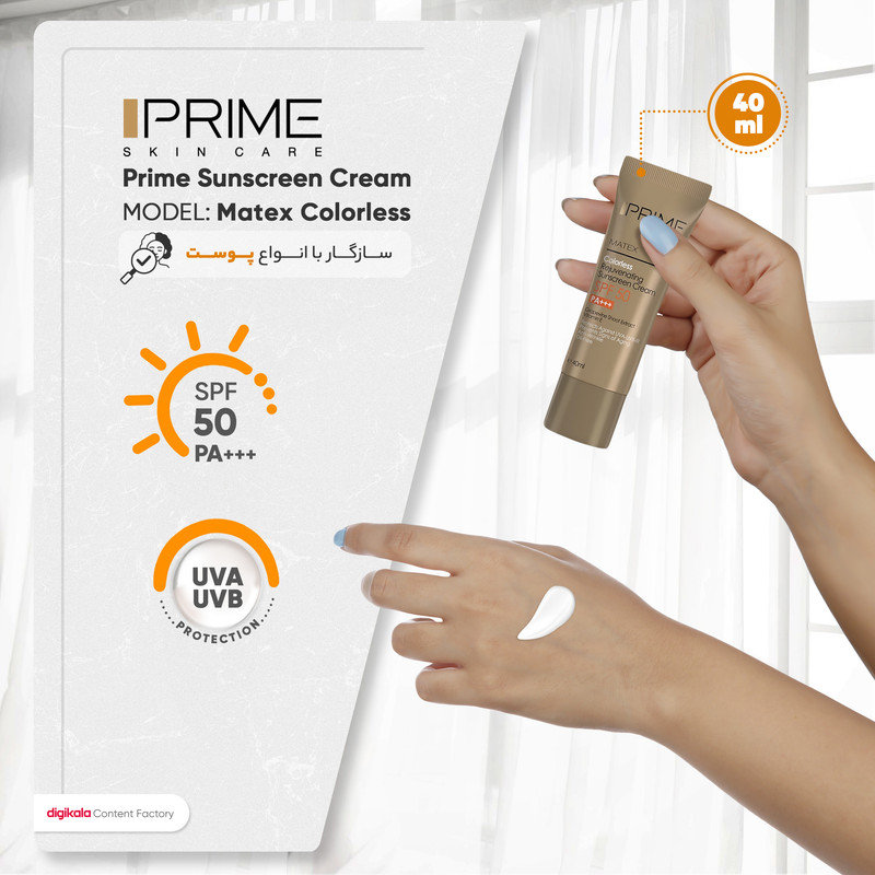 کرم ضد آفتاب و ضد چروک بی رنگ پرایم مدل Matex Colorless SPF50 مناسب انواع پوست حجم 40 میلی لیتر