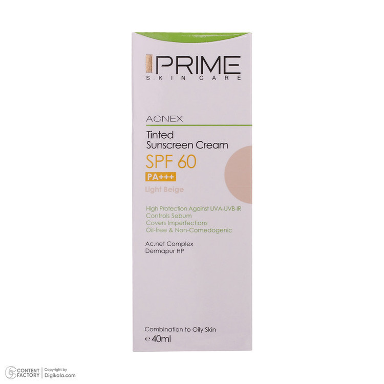 کرم ضدآفتاب رنگی پرایم SPF60 مدل Acnex، مناسب پوستهای چرب، حجم 40 میلیلیتر