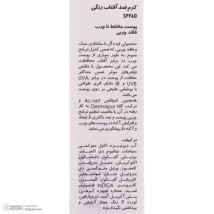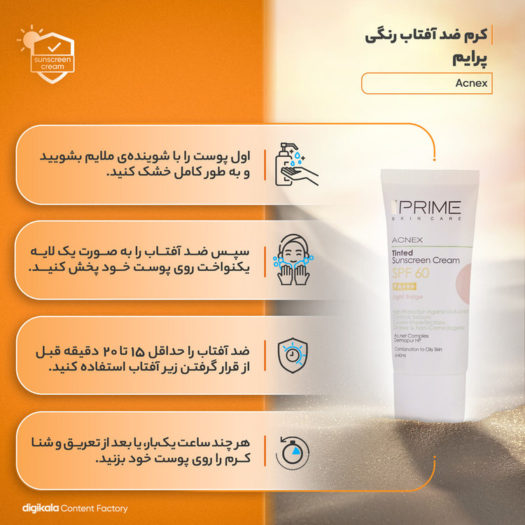 کرم ضدآفتاب رنگی SPF60 یکی از محصولات کارخانهی ایرانی «پرایم» بوده که به نام «Tinted Sunscreen Cream SPF60» نیز شناخته میشود و محصولی با کیفیت بالا در کنار رقبای خارجی است. این محصول محافظی قوی برای پوست در برابر اشعههای UVA، UVB، IR بهشمار میرود و با قابلیت کنترل ترشح سبوم و برخورداری از خاصیت ضدآکنهبودن، مهارکنندهی قوی باکتریهای مولد آکنه بهشمار میرود. این محصول ماتکننده و فاقد چربی به رنگ بژ روشن ارائه شده است و میتواند انواع لک و جای جوش را بپوشاند. بهترین روش مصرف این کرم ضدآفتاب پوشاندن پوست با مقدار کافی از کرم و 20 دقیقه قبل از قرارگرفتن در معرض نور آفتاب است. برای کسب نتیجهی دلخواه، بهتر است مصرفکننده هر دو ساعت یک بار، یک لایهی جدید از کرم روی پوست خود بکشد. همچنین در مواردی مانند تعریق شدید، شنا یا در ساعاتی از روز که تابش نور شدیدتر است، میتوان ضدآفتاب را در فواصل زمانی کوتاهتر تجدید کرد. حجم بطری آن 40 میلیلیتر است. این محصول که ویژهی صورت در نظر گرفته شده، برای پوست آقایان و خانمها ساخته شده است؛ بنابراین محدودیتی در جنسیت مصرفکننده ندارد و برای تمامی سنین مناسب است.