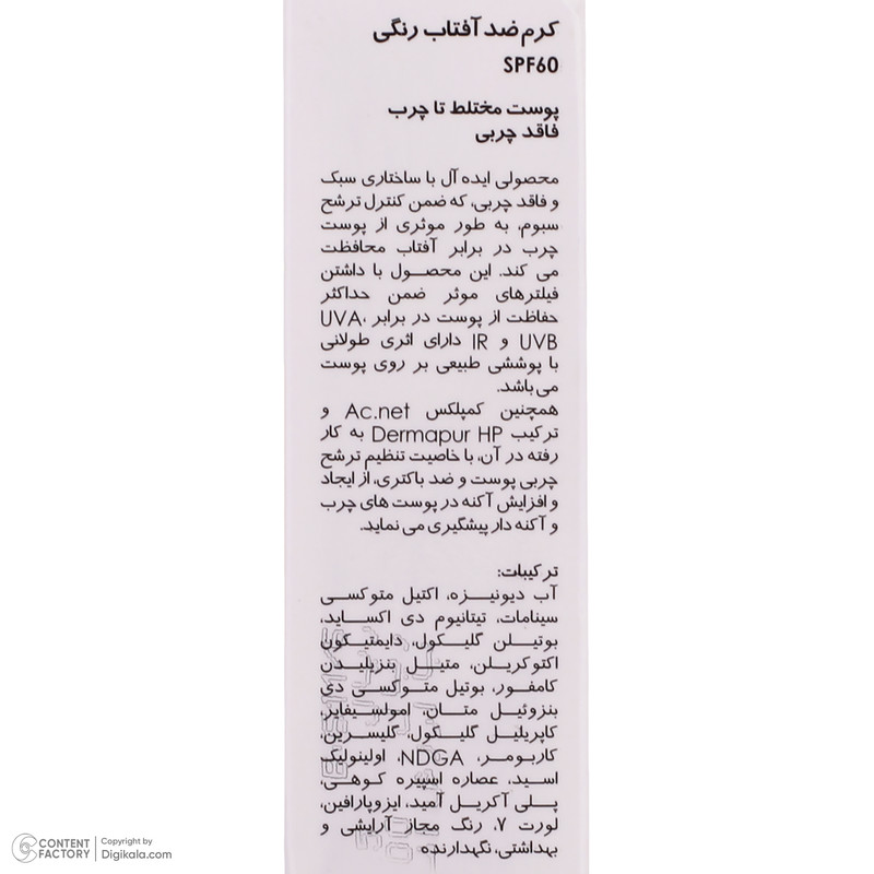 کرم ضدآفتاب رنگی پرایم SPF60 مدل Acnex، مناسب پوستهای چرب، حجم 40 میلیلیتر