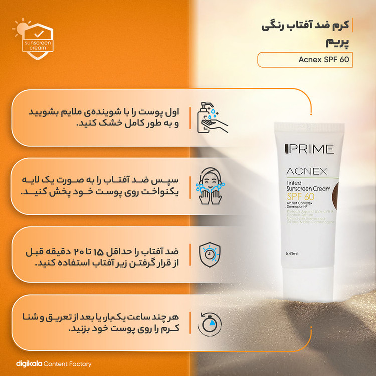 کرم ضدآفتاب رنگی پرایم مدل Acnex SPF60، مناسب پوستهای چرب، حجم 40 میلیلیتر