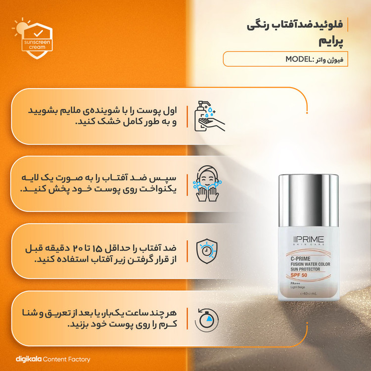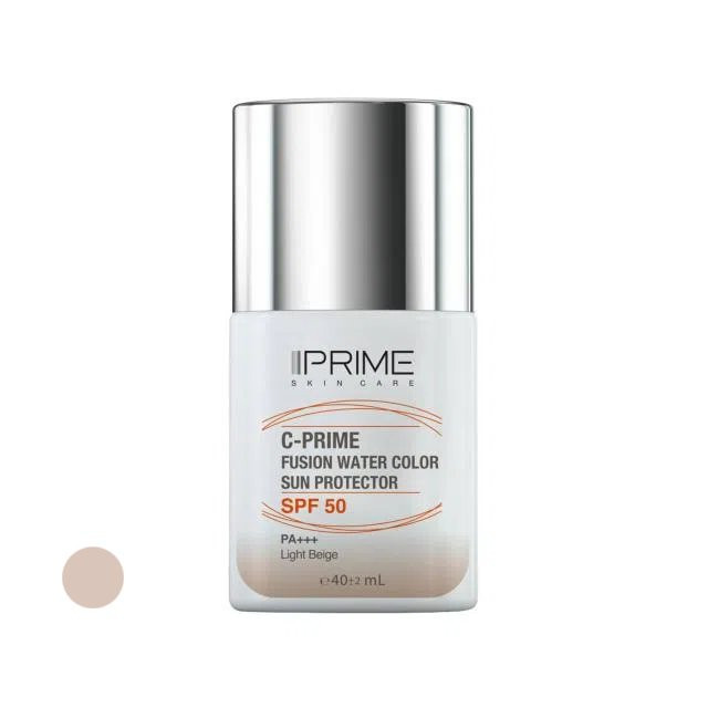 فلوئید ضد آفتاب رنگی پرایم، SPF 50، مدل فیوژن واتر، مناسب انواع پوست با تنالیته روشن و حجم 40 میلی لیتر، محافظتکننده در برابر اشعههای PA++++ ،UVA ،UVB، دارای فرمولاسیون فاقد چربی، ویتامین سی و آنتی اکسیدان، با ماندگاری 4 ساعته