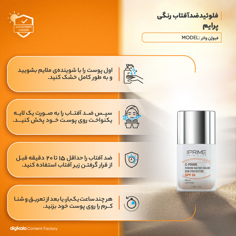 فلوئید ضد آفتاب رنگی پرایم، SPF 50، مدل فیوژن واتر، مناسب انواع پوست با تنالیته روشن و حجم 40 میلی لیتر، محافظتکننده در برابر اشعههای PA++++ ،UVA ،UVB، دارای فرمولاسیون فاقد چربی، ویتامین سی و آنتی اکسیدان، با ماندگاری 4 ساعته