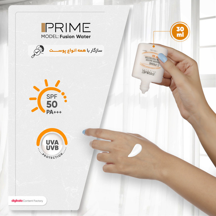 لوسیون ضدآفتاب بیرنگ پرایم SPF50 مدل Fusion Water، مناسب پوستهای چرب، حجم 30 میلیلیتر