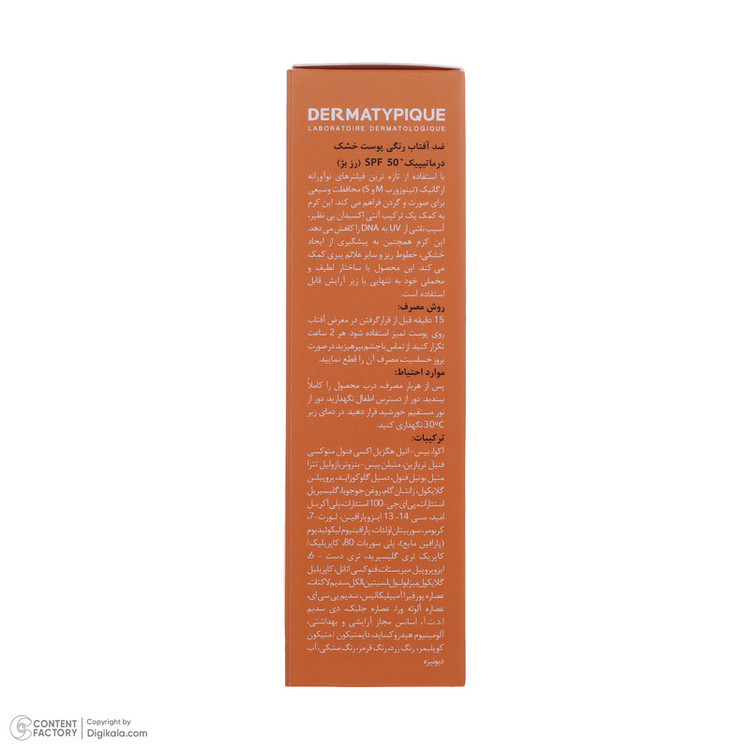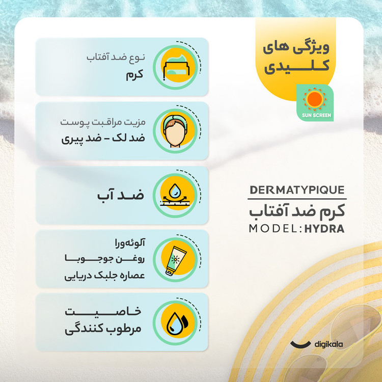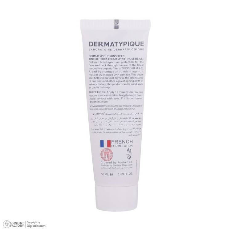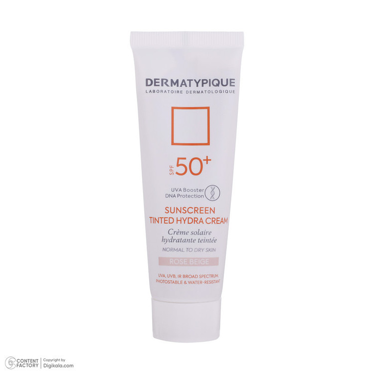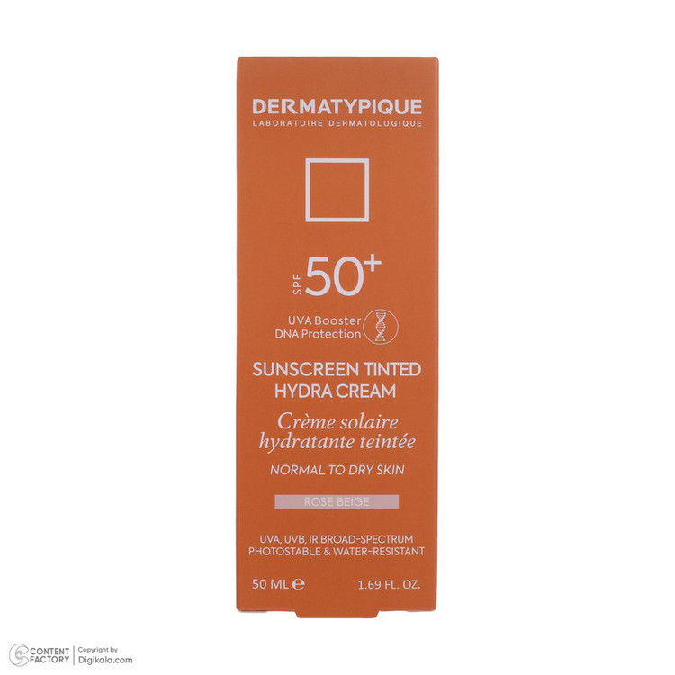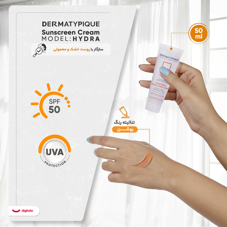 کرم ضد آفتاب رنگی درماتیپیک، 50 SPF، مدل هیدرا، مناسب پوست نرمال تا خشک تنالیته رنگ روشن و حجم 50 میلیلیتر، محافظت کننده در برابر اشعه UVA، UVB، IR، ضد آب، ضد خطوط ریز و پیری پوست، مرطوب کننده، التیامبخش، با ماندگاری 2 ساعته