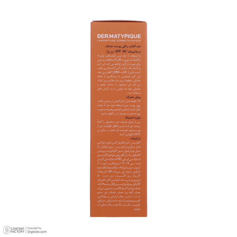 کرم ضد آفتاب رنگی درماتیپیک، 50 SPF، مدل هیدرا، مناسب پوست نرمال تا خشک تنالیته رنگ روشن و حجم 50 میلیلیتر، محافظت کننده در برابر اشعه UVA، UVB، IR، ضد آب، ضد خطوط ریز و پیری پوست، مرطوب کننده، التیامبخش، با ماندگاری 2 ساعته
