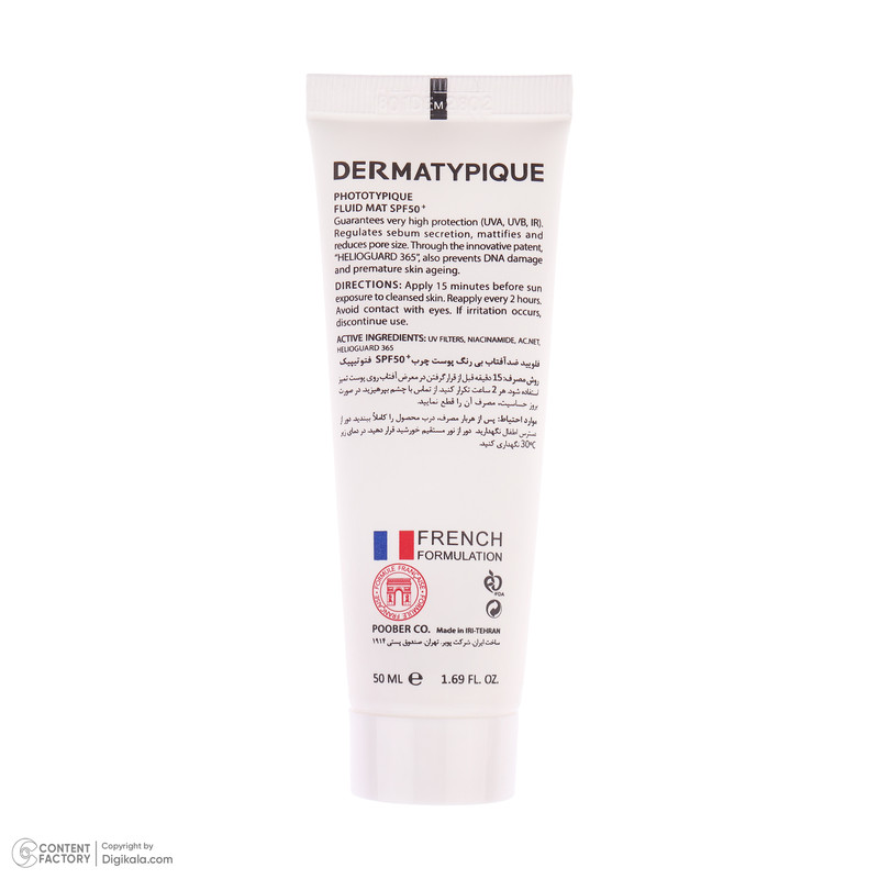 فلوئید ضد آفتاب بدون رنگ درماتیپیک مدل مات محافظ UVA،UVB مناسب برای پوست چرب حجم 50 میلی لیتر