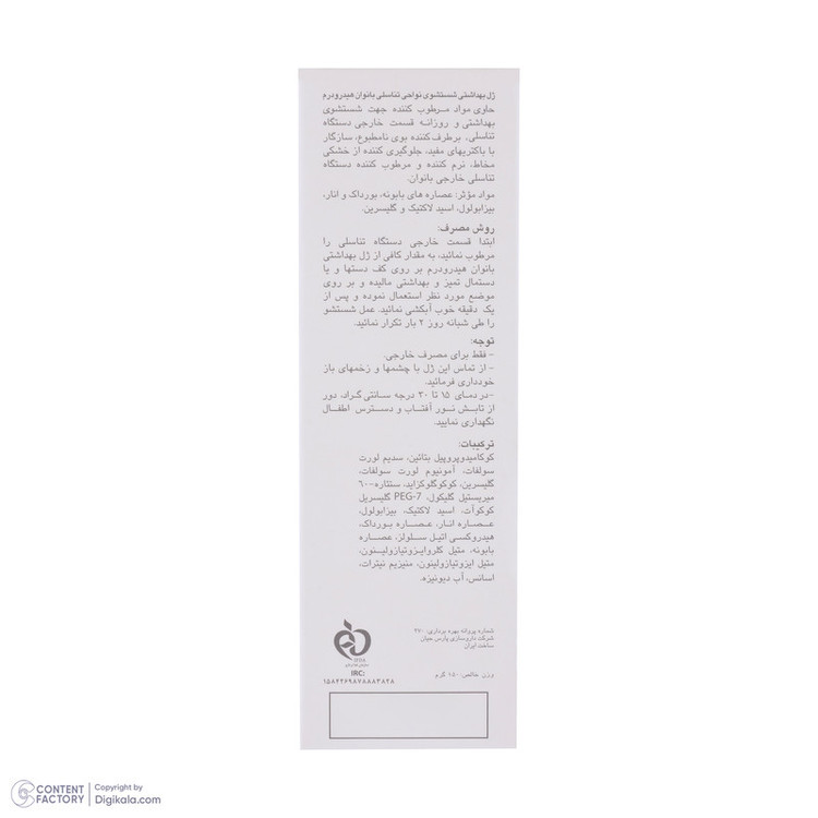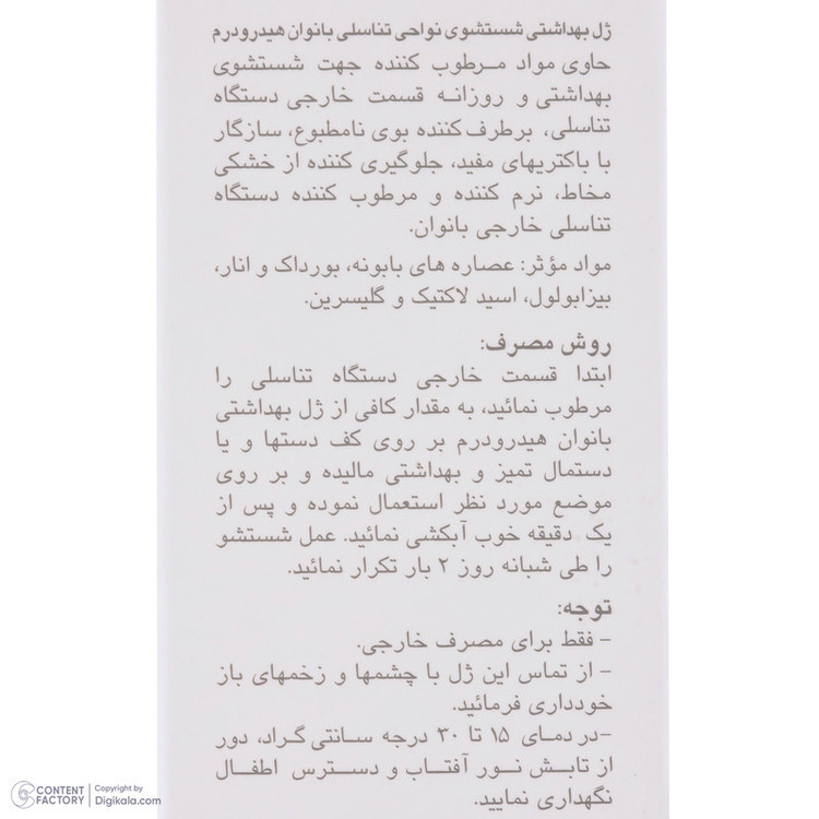 افزایش میزان اسیدیته در ناحیهی خارجی واژن احتمال افزایش میزان باکتریها را بیشتر میکند. این باکتریها ممکن است باعث ایجاد بیماری یا بوی ناخوشایند شوند. بر اثر ترکیب باکتریها با ترشحات اطراف واژن، بوی نامطبوعی تولید میشود که برای فرد آزاردهنده است. برای جلوگیری از این مشکل استفاده از محصولات بهداشتی ویژه توصیه میشود که علاوبر اینکه پوست ناحیهی خارجی واژن را بیش از حد خشک نمیکند، سبب از بین رفتن باکتریها میشود. شرکت «هیدرودرم» در سری محصولات ویژهی خود برای بانوان به تولید ژل بهداشتی اقدام کرده که مناسب شستوشوی روزانه است. این ژل حاوی گلیسیرین وعصارهی بابونه با خاصیت ایجاد اثر ضدالتهابی در پوست است که مانع از تغییر و خشکی پوست در ناحیهی خارجی دستگاه تناسلی بانوان میشود. در ترکیبات این محصول از مواد حساسیتزا استفاده نشده است تا اثری ملایم اما موثر داشته باشد. روش استفاده از این محصول به صورت روزانه یا مواقعی است که احتمال ایجاد بوی ناخوشایند به دلیل هوای گرم و ورزش بیشتر است.