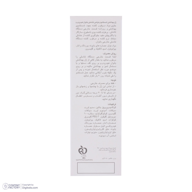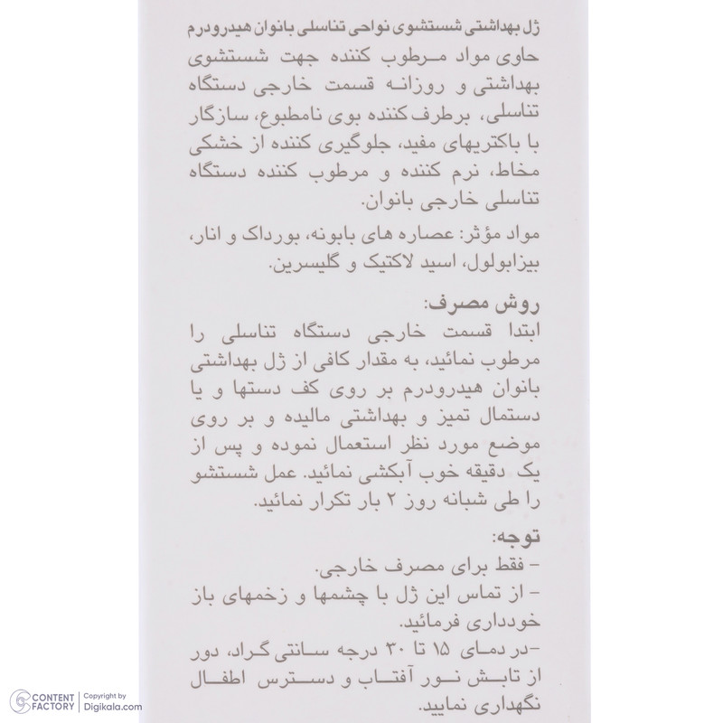 افزایش میزان اسیدیته در ناحیهی خارجی واژن احتمال افزایش میزان باکتریها را بیشتر میکند. این باکتریها ممکن است باعث ایجاد بیماری یا بوی ناخوشایند شوند. بر اثر ترکیب باکتریها با ترشحات اطراف واژن، بوی نامطبوعی تولید میشود که برای فرد آزاردهنده است. برای جلوگیری از این مشکل استفاده از محصولات بهداشتی ویژه توصیه میشود که علاوبر اینکه پوست ناحیهی خارجی واژن را بیش از حد خشک نمیکند، سبب از بین رفتن باکتریها میشود. شرکت «هیدرودرم» در سری محصولات ویژهی خود برای بانوان به تولید ژل بهداشتی اقدام کرده که مناسب شستوشوی روزانه است. این ژل حاوی گلیسیرین وعصارهی بابونه با خاصیت ایجاد اثر ضدالتهابی در پوست است که مانع از تغییر و خشکی پوست در ناحیهی خارجی دستگاه تناسلی بانوان میشود. در ترکیبات این محصول از مواد حساسیتزا استفاده نشده است تا اثری ملایم اما موثر داشته باشد. روش استفاده از این محصول به صورت روزانه یا مواقعی است که احتمال ایجاد بوی ناخوشایند به دلیل هوای گرم و ورزش بیشتر است.