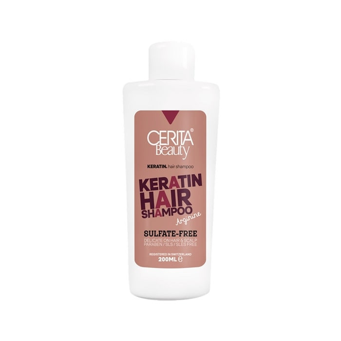 شامپو فاقد سولفات مناسب موهای کراتینه CERITA Beauty، دارای آرژنین و پانتنول است که نرم کننده و رطوبت رسان برای ساقه مو بوده و با وجود سدیم PCA رطوبت ساقه مو را حفظ نموده و خشکی و شکنندگی ساقهی مو را برطرف میکند.شامپو فاقد سولفات مناسب موهای کراتینه سریتا، شویندهای ملایم برای موها است که بدون تاثیر مخرب روی موهای کراتینه شده، ضمن پاک کردن کامل آلودگیهای مو و پوست سر، از کراتین مو نیز محافظت مینماید. این شامپو با نفوذ به لایه خارجی مو منجر به صاف شدن موها و کمک به جذب و نگهداری رطوبت در مو میشود. شامپوهای حاوی سولفات روی رنگدانه موهای رنگ شده تاثیر گذاشته و موجب میگردند که موها رنگ خود را سریعتر از دست بدهند. به همین دلیل آرایشگران بعد از کراتینه و رنگ کردن موها استفاده از شامپوهای فاقد سولفات را توصیه میکنند.