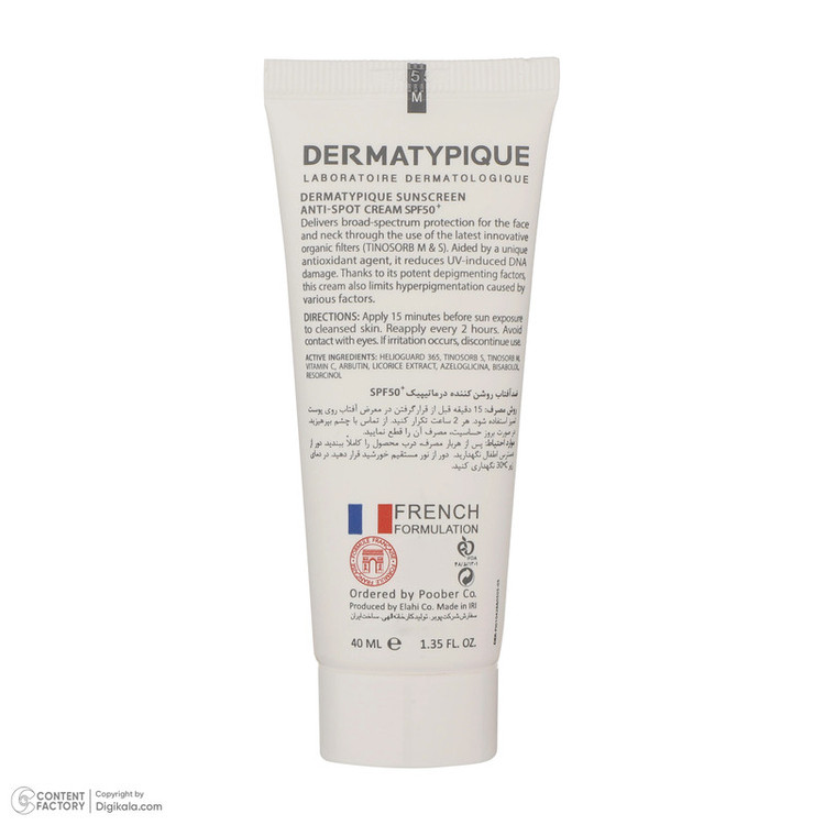 کرم ضدآفتاب بیرنگ درماتیپیک SPF50 مدل Anti spot مناسب انواع پوست، حجم 40 میلیلیتر