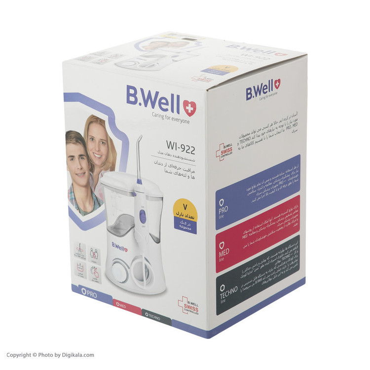 B.Well در سال 2004 میلادی توسط گروهی از پزشکان مقیم لندن تاسیس شد و در مدت زمان کوتاهی توانست اعتماد بسیاری از کاربران را به دست آورد. دستگاه شست و شوی دهان و دندان بی ول مدل WI-922 با قابلیت تمیز کردن قوی به حفظ سلامتی دندان، زبان و لثههای شما کمک میکند. این شستشو دهنده با بکارگیری ترکیبی از جریان پرفشار و جهندهی آب به از بین بردن باکتریهای مضر از نواحی عمیق بین دندانی و زیر خط لثه که نمیتوان با مسواک به آنها دسترسی پیدا کرد، کمک میکند. این دستگاه دارای هفت نازل برای تمامی نیازهای مصرفکننده است که این هفت نازل عبارتاند از: 3 نازل استاندارد برای مراقبت از دهان، نازل تمیزکننده زبان، نازل ارتودنسی(برای براکتهای دندانها)، نازل برای ایمپلنت(پل، تاج و روکش دندان) و نازل پریودنتال(برای لثهها). این دستگاه دارای پایهی ثابت بدون لغزش، نازل با قابلیت چرخش 360 درجه، نگهدارندهی مناسب برای دستهی دستگاه و یک کلید پیچشی کنترل برای تنظیم میزان شدت عملکرد دستگاه در ده حالت مختلف است.