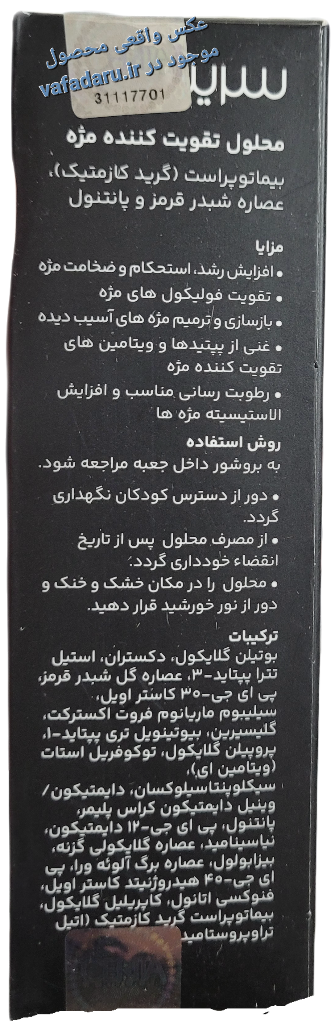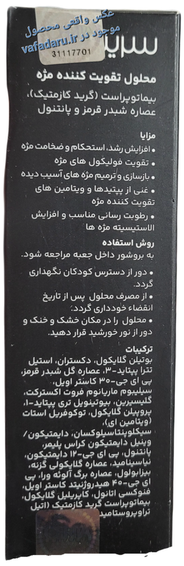 محلول تقویت کننده مژه سریتا مدل Eyelash special است. حجم 8 میلی لیتر است. محلول تقویت مژه سریتا یکی از تاثیرگذارترین محصولات برای تقویت و افزایش رشد مژههاست که از بدو تولید تاکنون مورد توجه بسیاری بوده و خود را در این زمینه ثابت کرده است. این محلول تخصصی با داشتن فرمولاسیون خاص و قوی میتواند فاز رشد مژه را طولانیتر و زمان ریزش طبیعی آن را کاهش دهد و از همین جهت برای کسانی که دچار ریزش مژه هستند یا دوست دارند مژهای پرتر و بلندتری داشته باشند بهترین انتخاب محسوب میشود. در ادامه بیشتر با محلول تقویت کننده مژه سریتا مدل Eyelash special حجم 8 میلی لیتر آشنا میشویم. ویژگیهای محلول تقویت کننده مژه سریتا است. محلول تقویت مژه سریتا یک محصول کاملا تخصصی است و به جرئت میتوان گفت بیشترین محبوبیت را بین سایر محصولات برای تقویت مژه دارد. این محلول برای افزایش طول و ضخامت مژهها و درمان ریزش مژه و همچنین پرپشت کردن مژها مورد استفاده قرار میگیرد. محلول تقویت کننده مژه سریتا مدل Eyelash special حجم 8 میلی لیتر دارای مواد موثر با کاراییهای مختلف است که استفاده از آن را اثربخش کرده است: بیماتوپروست به رشد مژه کمک بسیاری میکند و فاز طبیعی ریزش مژه را کمتر میکند. این ماده همچنین سبب پرپشت شدن مژهها میشود. شبدر قرمز دارای خواص آنتی اکسیدانی است و به تغذیه و تقویت فولیکولهای مژه کمک میکند و با افزایش خون رسانی به رشد مژهها کمک میکند.ویتامینB7 و B5 از خشکی مژهها جلوگیری میکنند و به ترمیم و بازسازی مژهها کمک میکنند، به علاوه با افزایش تولید پروتئین در بن مژه خاصیت تقویتی دارند. آلوئه ورا در تقویت کننده مژه سریتا اثر رطوبت بخش دارد و مژههایی شاداب بدون خارش و التهاب را به وجود میآورد.
