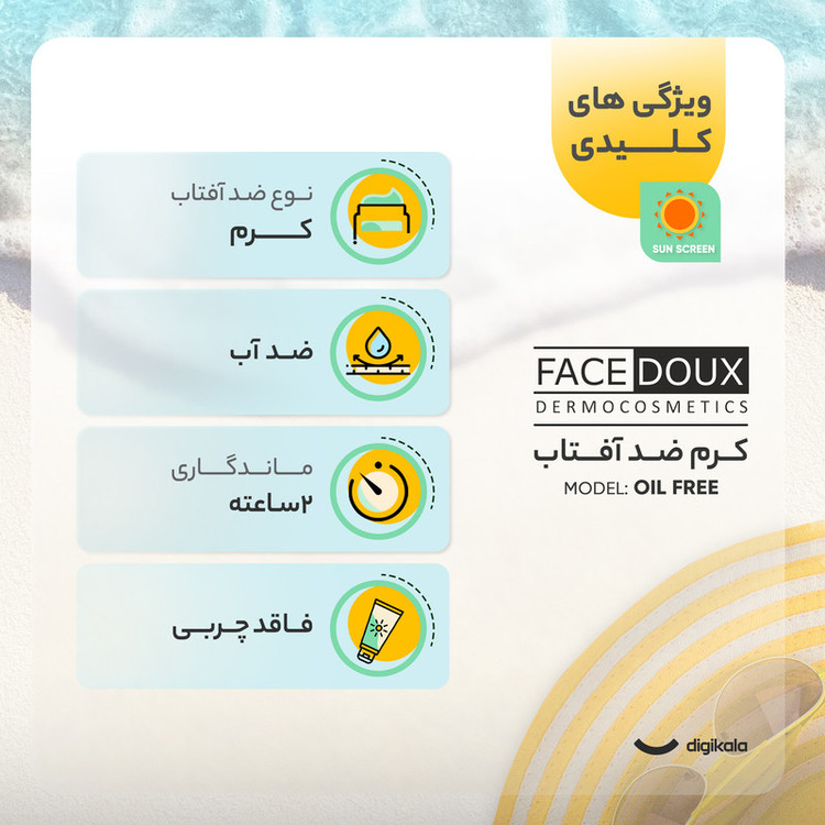 ویژگیهای ضدآفتاب : ضد آب , محافظت کننده در برابر اشعه UVA , محافظت کننده در برابر اشعه UVB